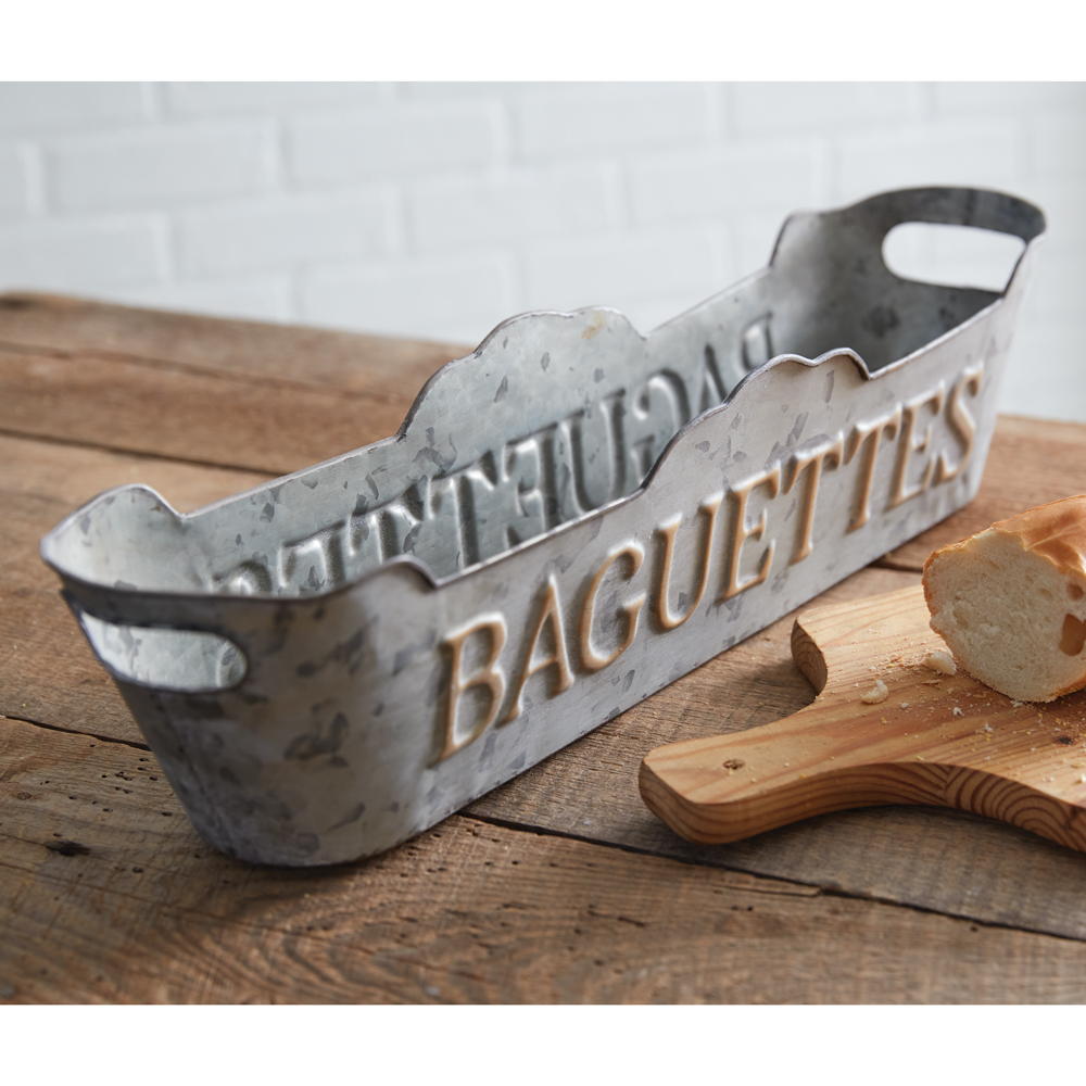 Add a little whimsy and a touch of the French countryside into your home with the help from our French Baguette Bins. Feature delicious, fresh baked bread inside or simply display on their own. Bins are made of galvanized metal and nest together for easy storage. Medium bin measures 21¼''W x 4½''D x 4¾''H and smallest bin measures 20¼''W x 4''D x 4¾''H. Item is not food safe, use with wrapped bread.